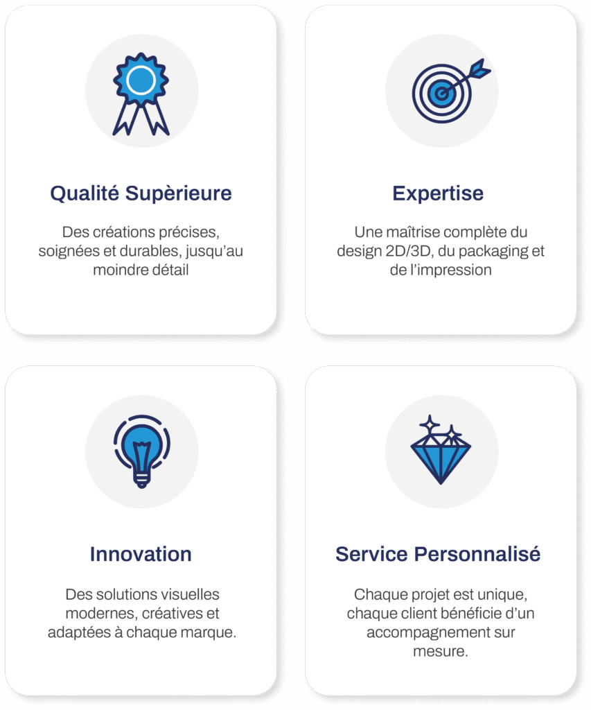 C’est pourquoi nous proposons des solutions sur mesure, alliant conception graphique 2D/3D, packaging personnalisé et impression grand format, pour vous accompagner de la création à la réalisation.